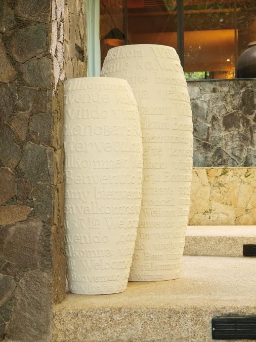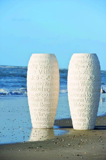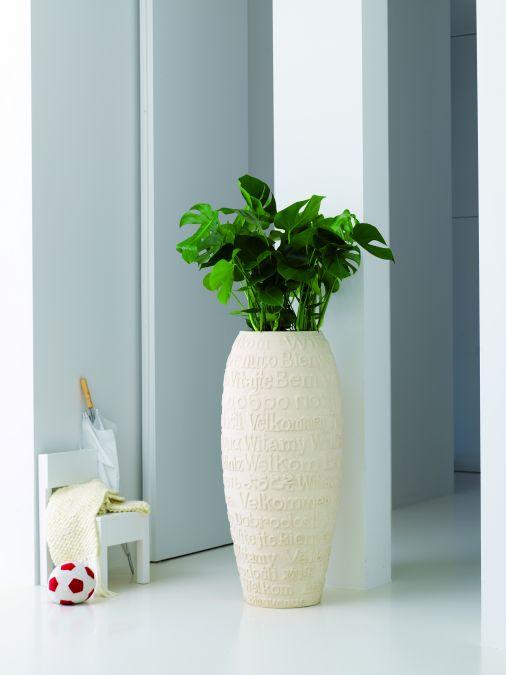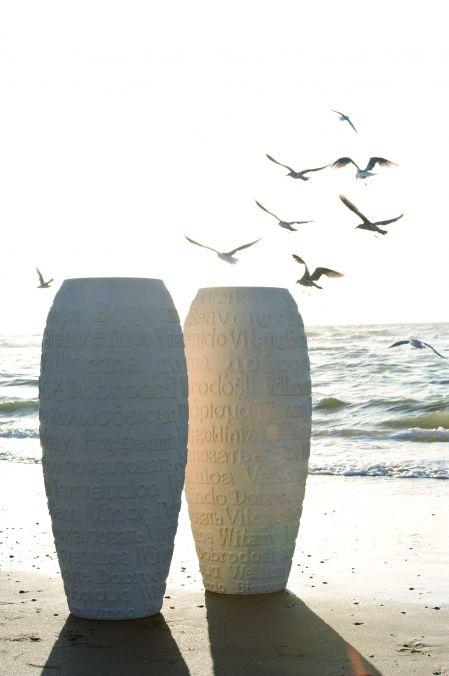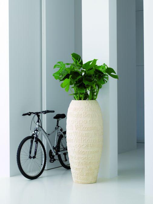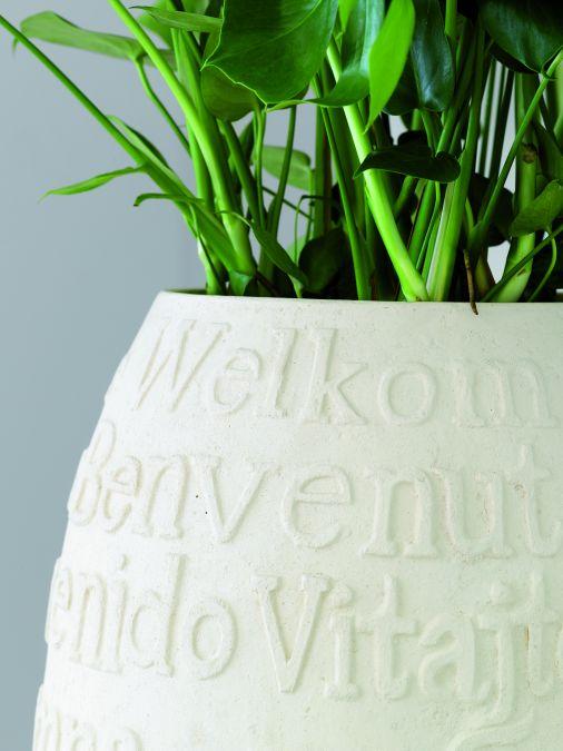 Cvetlični lonci naravne barve so izdelani iz lahkega in robustnega materiala ter so primeren tako za notranjo kot zunanjo uporabo. Beseda dobrodošlije upodobljena v naslednjih jezikih: v angleščini, nizozemščini, francoščini, nemščini, grščini, italijanščini, portugalščini, ruščini, španščini, kitajščini (mandarinščina), švedščini, norveščini, danščini, finščini, slovaščini, češčini, poljščini, hrvaščini, slovenščini, filipinščini, apanščini, arabščini in turščini.